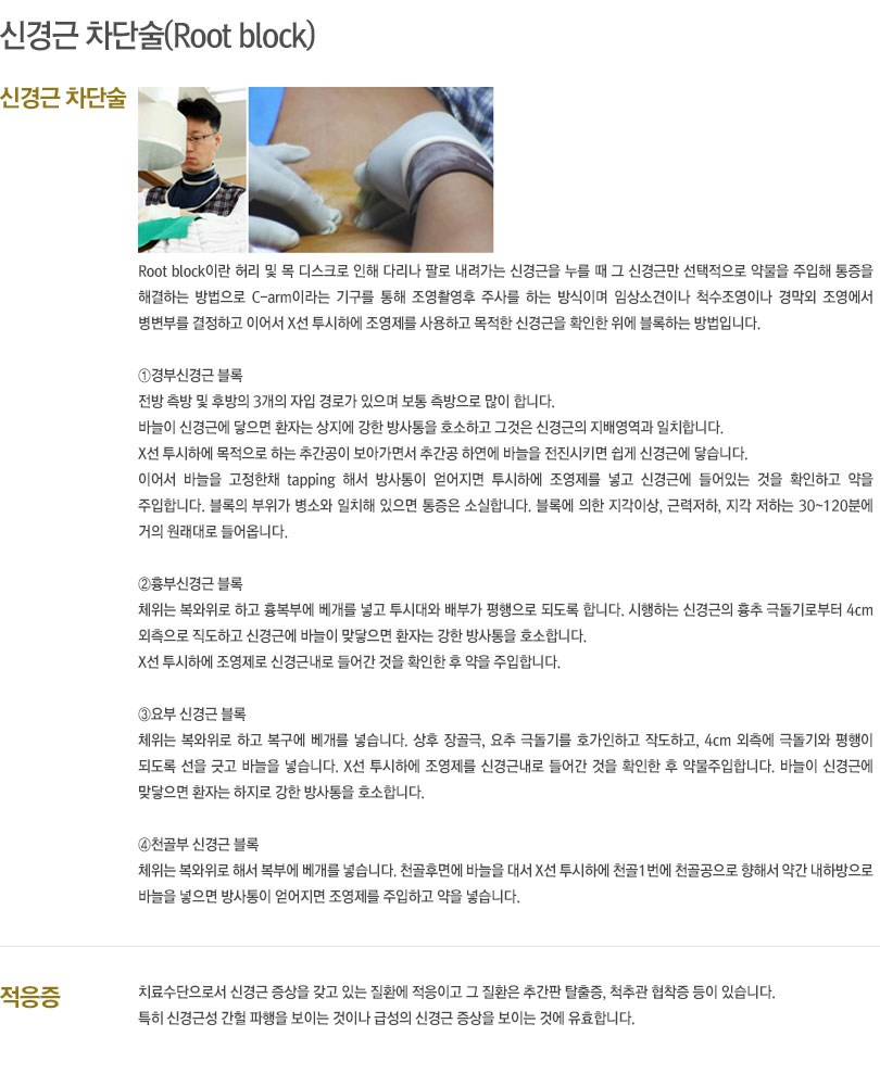 각종 급,만성 통증의 조절과 암성 통증의 조절을 위해 이용할 수 있는 신경차단 치료법에 크게 50여 종류가 넘는다.