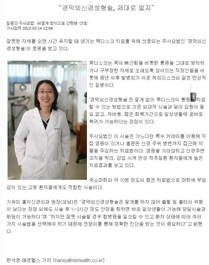 [매경헬스 12.3.14]"경막외신경성형술,제대로 알자"
