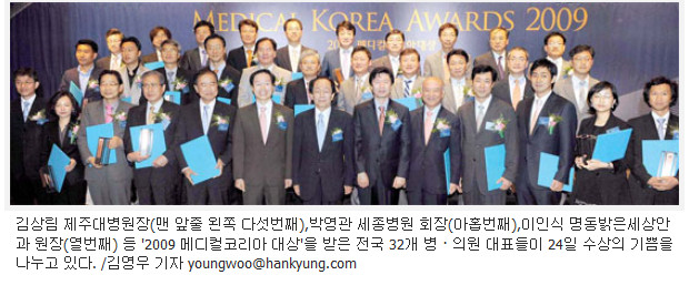 2009메디컬코리아 대상 신경외과부문 대상 "홍익신경외과""명품병원 선정 계기로 해외환자 적극 유치하겠다" '2009 메디컬코리아 대상' 시상 김상림 제주대병원장(맨 앞줄 왼쪽 다섯번째),박영관 세종병원 회장(아홉번째),이인식 명동밝은세상안과 원장(열번째) 등 '2009 메디컬코리아 대상'을 받은 전국 32개 병 · 의원 대표들이 24일 수상의 기쁨을 나누고 있다. /김영우 기자 " rel="nofollow"> 대한민국을 대표하는 진료 분야별 32개 '명품' 의료기관을 엄선한 '2009 메디컬코리아 대상' 시상식이 24일 오전 서울 신라호텔 다이너스티홀에서 300여명이 참석한 가운데 성대하게 열렸다. 한국경제신문과 한국경제TV 한경닷컴이 주최한 이날 행사에서 수상자들은 "이용객과 네티즌이 가장 깊이 기억하고 만족도가 높은 병원으로 뽑아줘 영광스럽다"며 "저평가된 한국 의료 수준을 제대로 알려 해외환자 유치 등 의료산업 선진화에 기여하겠다"고 다짐했다. 심장병센터 부문 대상을 차지한 세종병원의 박영관 회장은 "향후 뇌혈관 질환으로 치료 영역을 넓히고 극동 러시아인을 포함한 외국인 환자를 연말까지 1000명 이상 유치하겠다"고 밝혔다. 최우수 지역 거점병원으로 선정된 제주대병원의 김상림 원장은 "올 3월 제주시 아라동으로 신축 이전하면서 최신 의료시설과 자연환경이 어우러진,환자 1인당 사용 면적이 전국에서 가장 넓은 병원으로 발돋움했다"고 말했다. 목정은 제일병원 원장은 "국내 최초의 여성전문 병원으로서 여성의학의 명가라는 위상을 유지할 수 있도록 여성암,출산,육아,불임 등 전 분야에서 연구와 시설 투자를 아끼지 않겠다"고 강조했다. 김종성 서울대병원 어린이병원장은 "다른 병원이 위험하고 수익이 낮다며 꺼리는 난치성 소아질환 전 분야를 커버할 수 있는 국내 유일의 병원"이라고 소개했다. 신용삼 서울성모병원 뇌졸중센터장은 "재활 및 줄기세포 치료를 이용해 1차 처치 후 남는 장애 후유증을 최소화하는 데 주력하겠다"고 밝혔다. 심찬섭 건국대병원 소화기센터 소장은 "추석 이후 15억원대의 최신 장비가 들어오고 내년 4월에는 대규모 확장 이전이 예정돼 있다"고 말했다. 치과 전문병원 대상을 받은 김석균 예치과 원장은 "인간 중심의 치료로 기능적으로나 미적으로 손색 없는 치아를 가꾸기 위해 노력해왔다"고 밝혔다. 얼굴윤곽 성형 전문인 아이디병원의 박상훈 원장은 "마취과 의사 상주,응급용 수혈팩 상시 구비,무균에어 샤워 및 무정전시스템 구축을 통해 지난 5년간의 무사고 기록을 지속해 나가겠다"고 말했다. 이인식 명동밝은세상안과 원장은 "사소한 부작용까지 합쳐 치료 후 불만을 호소하는 고객의 비율이 0.3%에 불과하다"며"최신 기술과 첨단장비 도입으로 레이저 시력교정 분야의 톱을 유지하겠다"고 설명했다. 송병호 미래이비인후과 원장은 "이명 어지럼증이 생기면 과거에는 뇌졸중 협심증만을 생각했지만 실제는 80%가 귀에서 생긴 문제"라며 "대학병원에서 수개월씩 기다릴 게 아니라 신뢰할 만한 개원의도 있다는 것을 알아주기 바란다"고 말했다. 정종호 기자 " rel="nofollow"> |
