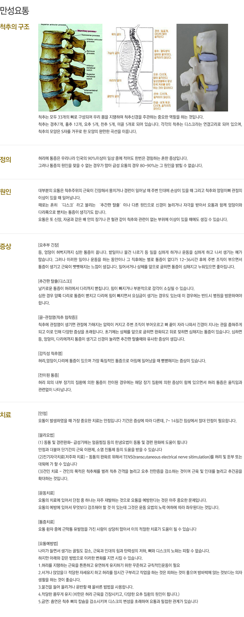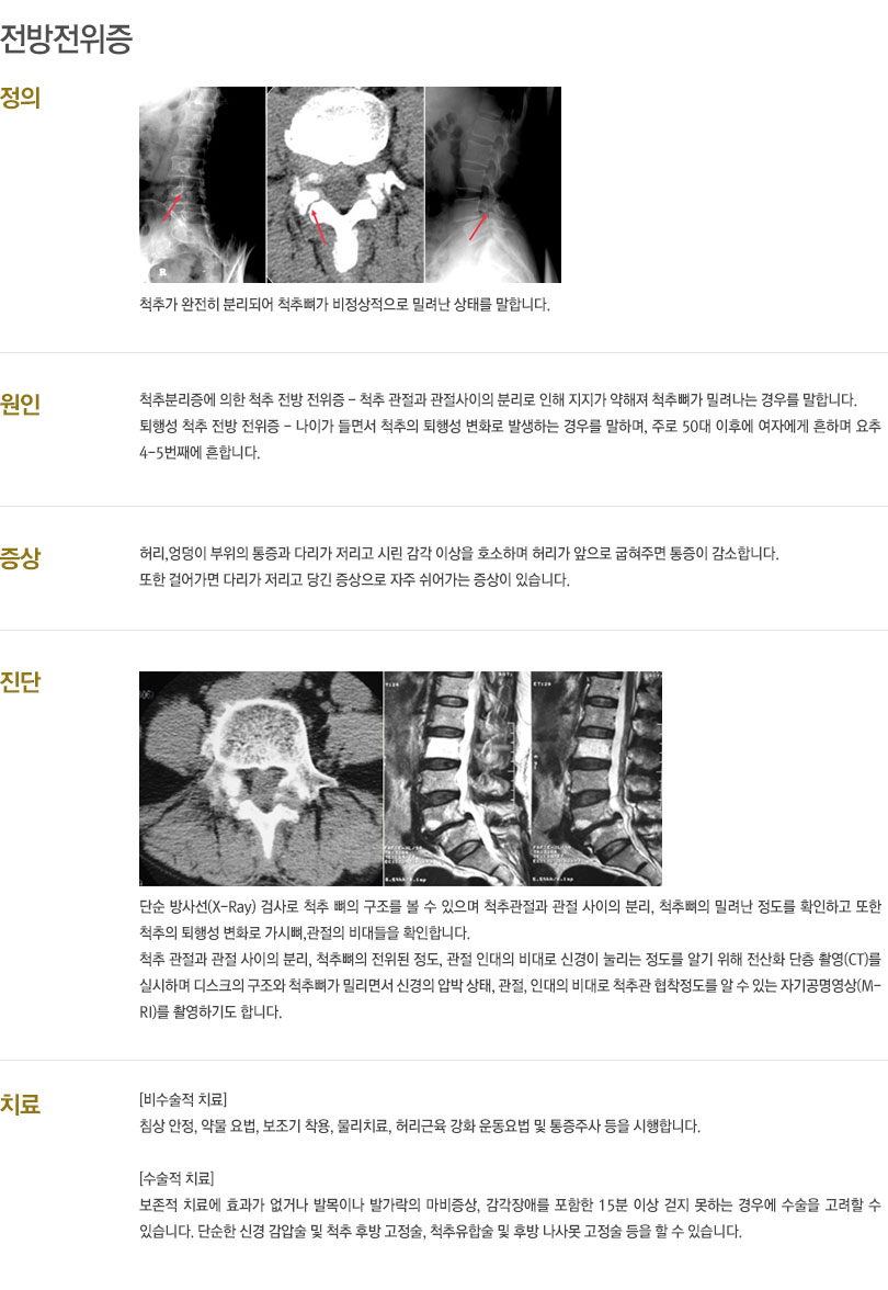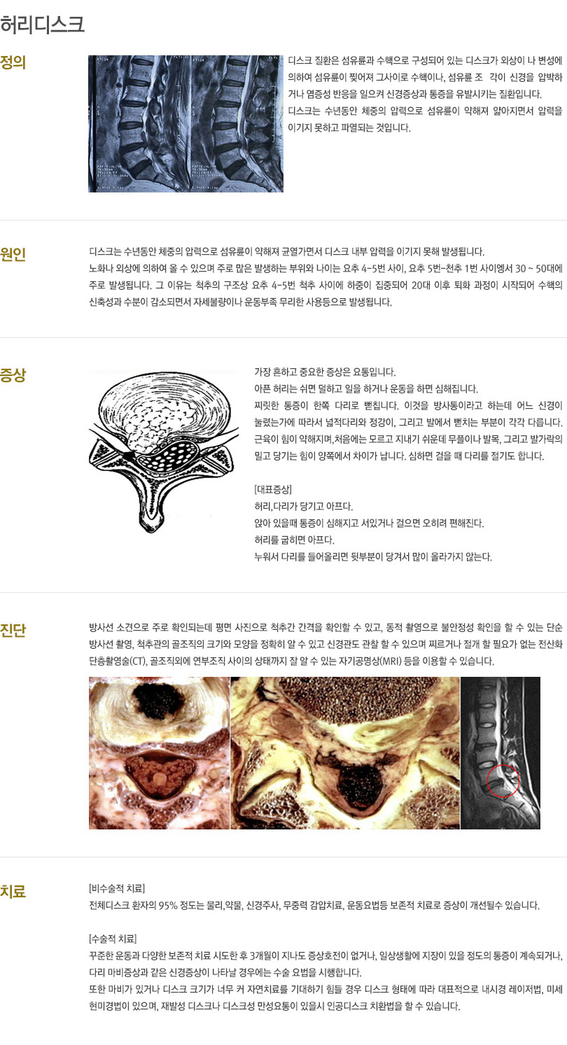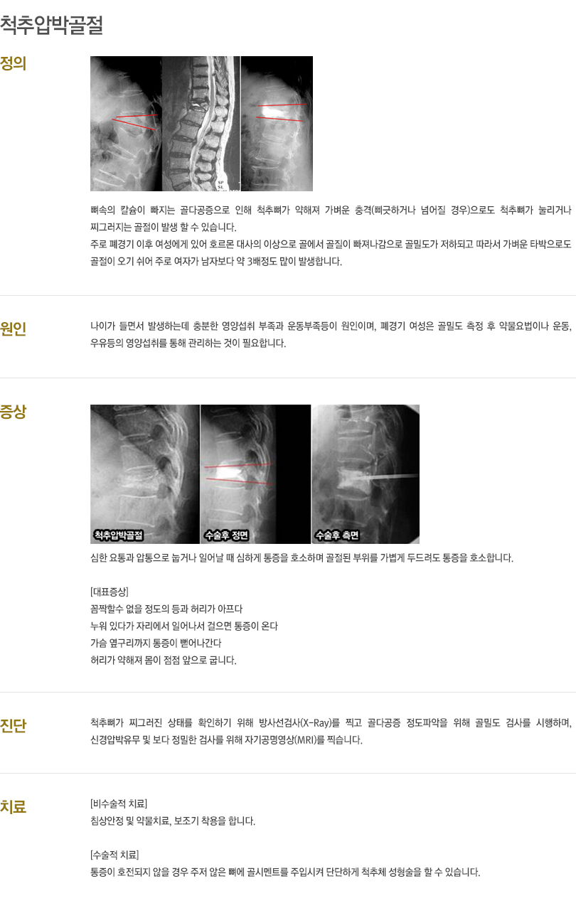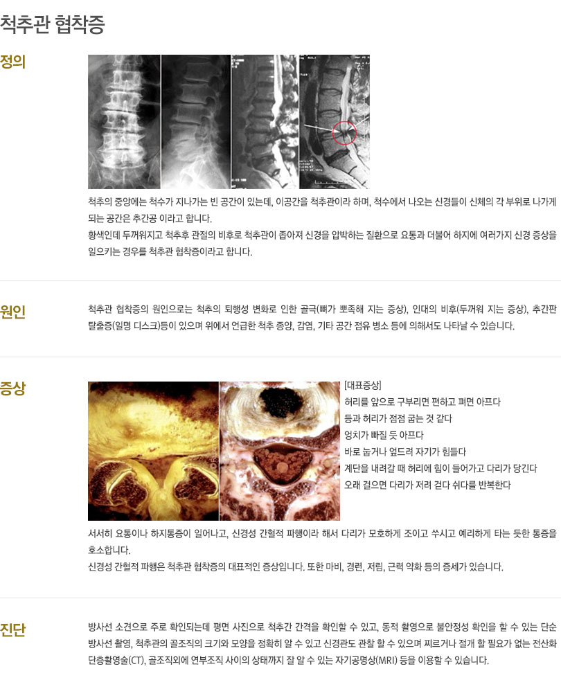 대표적인 질환은 척추관협착증, 퇴행성 디스크, 척추압박골절, 척추전방전위증 등이 있습니다.